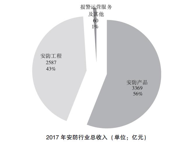 以产业结构划分,2017年,安防产品总收入约为3369亿元,占比56%;安防工程总收入为2587亿元,占比43%;报警运营服务及其他约为60亿元,占比1%。